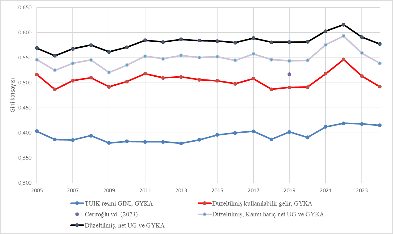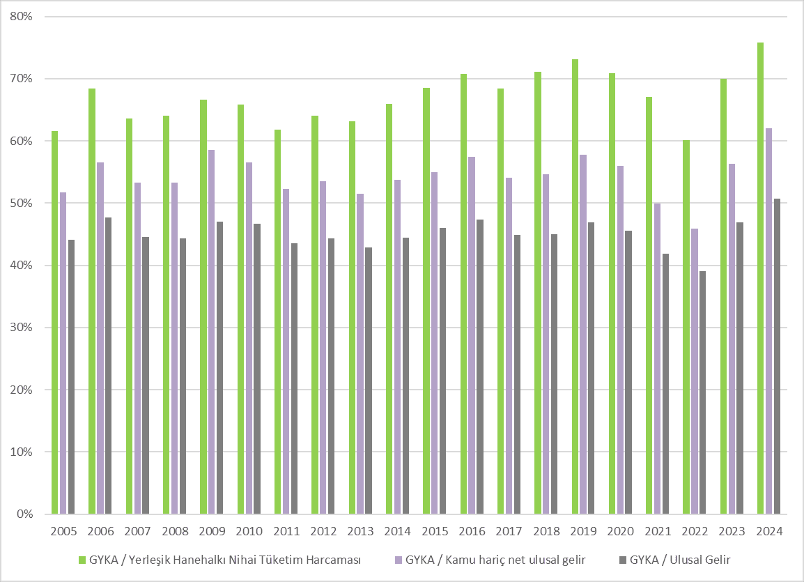 Kaynak: TÜİK Gelir Dağılımı verileri ve TÜİK GSYİH Harcama ve Gelir yöntemleri verileri. Notlar: GYKA: Gelir ve Yaşam Koşulları Anketi. Ulusal Gelir: GSYİH’den Sabit Sermaye Tüketimi (SST) düşülünce elde edilen gelir (net UG = GSYİH – SST). Kamu hariç net ulusal gelir: Ulusal gelirden devletin ve kâr amacı gütmeyen kuruluşların nihai tüketim harcamaları (G) düşüldükten sonra elde edilen gelir (Kamu hariç UG = GSYİH – SST – G = C + (I – SST) + (X –M); I toplam yatırımlar; X: ihracat; M: ithalat; C: yerleşik hanelerin nihai tüketim harcamaları).
