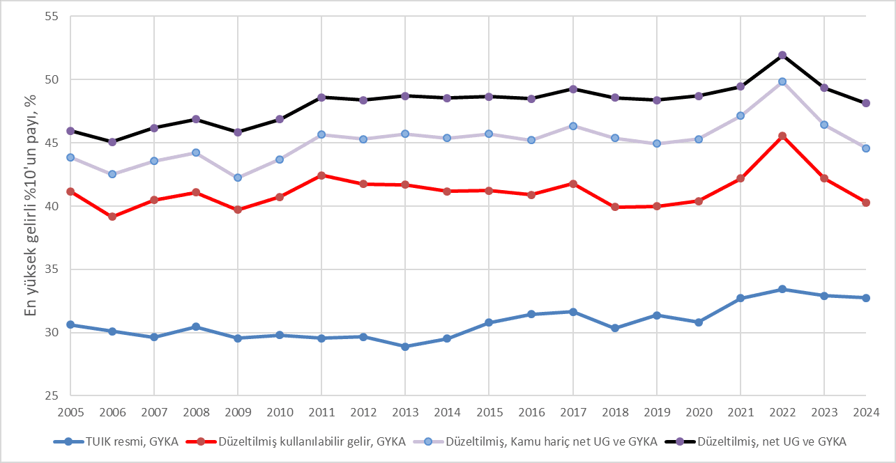 Nitekim geçtiğimiz yıl yayımladığımız makalemizde (Tekgüç ve Eryar, 2025) TÜİK’in hanehalkı anketlerinin, ücret, emekli aylığı gibi gelir tiplerini, yılına göre değişmekle birlikte yüzde 85-95 ölçeğinde iyi ölçtüğünü, ama faiz ve kâr gibi gelirleri yüzde 9-40 ölçeğinde yakalayabildiğini gösterdik. Diğer bir deyişle, anketlerdeki eksik gelirler, anketörlere kapısını açmayan, açsa da doğru beyanda bulunmayan zenginlerin elinde yoğunlaşmasını beklediğimiz faiz, kira ve kârlardır. Dolayısıyla da, anketlere dayalı eşitsizlik ölçümleri sistematik olarak aşağı yönlüdür ve gelir eşitsizliği politikalarının etkilerinin yanlış değerlendirilmesine yol açmaktadır.