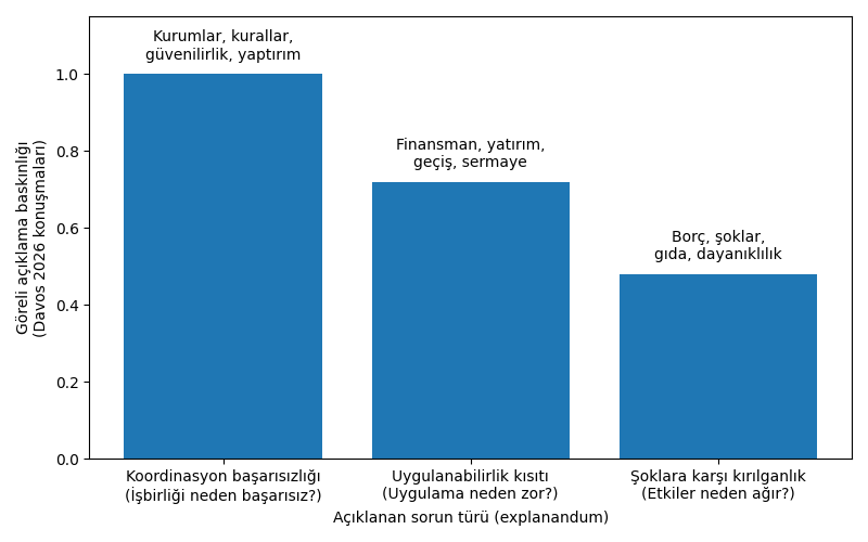 Davos 2026 konuşmaları, küresel sorunlara dair uzlaşıdan çok açıklama düzeyinde bir çoğulluk olduğunu gösteriyor: liderler aynı olgular hakkında konuşsalar da farklı “neden?” sorularına (koordinasyon başarısızlığı, uygulanabilirlik kısıtı, kırılganlık) cevap veriyorlar. Sorun, aktörlerin tutarsızlığı değil; bu farklı açıklamaların birbirini ikame edemeyen politika mekanizmaları gerektirmesi ve küresel yönetişimin çoğu zaman tek bir baskın mekanizmaya dayanmasıdır. Bu açıdan, küresel tıkanıklıklar, yanlış politikaların yanı sıra yanlış bir şekilde ortak olduğu varsayılan sorulardan da kaynaklanıyor.