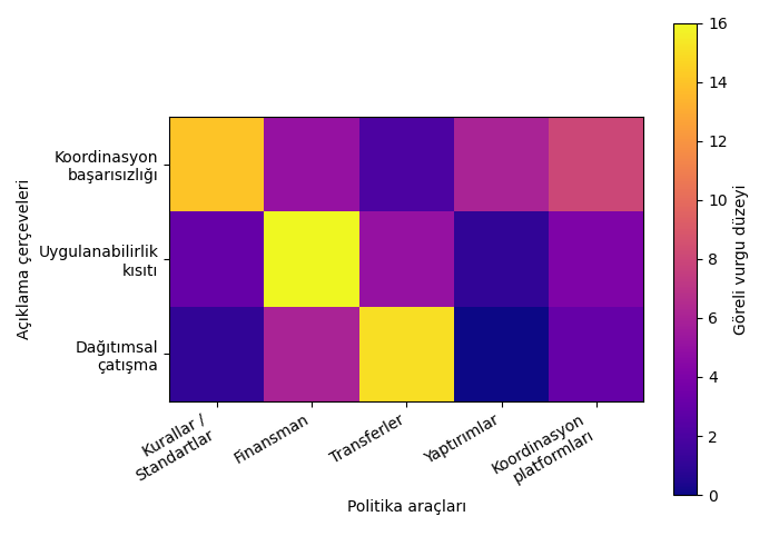 Şekil 2, konuşmalarda geçen farklı açıklama çerçevelerinin (kısıtların) ve politika araçlarının eşleşmesini göstermektedir. Her bir açıklama çerçevesi kendi içinde tutarlı politika araçlarıyla ilişkilendirilmektedir: koordinasyon başarısızlığı kurallarla, uygulanabilirlik kısıtları finansmanla, dağıtımsal çatışmalar ise transferlerle eşleştirilmektedir. Şekil, bireysel düzeyde tutarsızlıktan ziyade, farklı açıklamaların (kısıtların) farklı ve ikame edilemeyen politika mekanizmaları gerektirdiğini ortaya koymaktadır. Bu durum, küresel yönetişimde tek baskın mekanizmaya öncelik verildiği durumlarda yapısal gerilimlere yol açabilmektedir. Örneğin, Paris Anlaşması kapsamında, iklim değişikliğine verilen baskın yanıt kurallara dayalı bir koordinasyon mekanizmasıdır. Ancak, iklim değişikliğini öncelikle bir uygulanabilirlik veya dağıtım sorunu olarak gören ülkeler için bağlayıcı kısıtlamalar finansmana erişim ve uyum maliyetleridir. Bunlara dair mekanizmaların nispeten yetersiz olması, koordinasyon kısıtı kurallar mekanizmasıyla kısmen ele alınsa bile, uygulanabilirlik ve dağıtım kısıtlarının bağlayıcı olmaya devam edeceği anlamına gelir. En nihayetinde, koordinasyon alanında da görünürde doğru araçlar kullanılsa dahi beklenen başarıya ulaşılamamıştır.