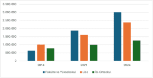 TBB verilerinden hareketle ulaşılan en kritik bulgulardan biri, borçluluğun eğitim düzeyine göre dağılımındaki radikal kaymadır. 2014 yılında borçlanma (tüketici ve konut kredileri) ağırlıklı olarak lise ve altı eğitim gruplarında yoğunlaşırken, 2021 sonrası tablo bu durumun “yüksek eğitimli” kesimlere doğru genişlediğini göstermektedir. Fakülte ve yüksekokul mezunu borçlu sayısı 2021’de 1,9 milyon iken, 2024 itibarıyla 3 milyon sınırını aşmıştır. Bu artış, sadece üniversite mezunu nüfustaki doğal genişlemeyle açıklanamaz. Nitekim 2014–2024 döneminde yükseköğretim mezunu nüfus %75 artarken, borçlu üniversite mezunu sayısının 600 binden 3 milyona çıkarak beş katına ulaşması yapısal bir kırılmaya işaret eder. Üniversite mezunları arasında borçlu olma oranının %8’den %23’e fırlaması, finansallaşmanın giderek daha fazla eğitimli ücretli kesimleri kapsadığını göstermektedir. Bu veriyi yorumlarken konut kredilerinin toplam borçlanma içindeki payının son yıllarda belirgin biçimde azaldığını ve TBB verilerinin kredi kartı borçlarını içermediğini hatırlamak gerekir.