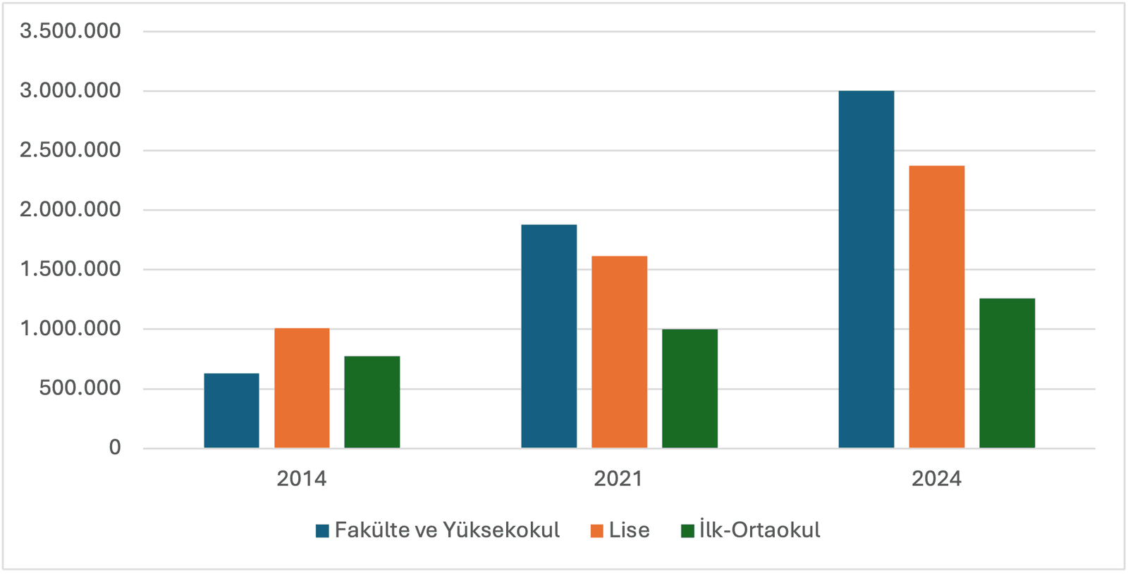 Grafik 2: Eğitim Düzeyine Göre Tüketici ve Konut Kredisi Kullanan Kişi Sayısı (2014–2024)