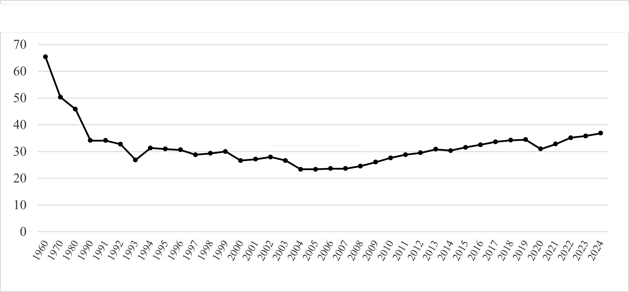 Şekil 1: Kadınların işgücüne katılım oranı (%), 1960-2024