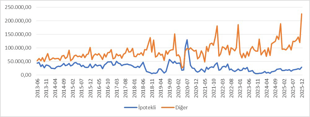 Türkiye’de konut fiyatları birçok bölgeden belirgin biçimde ayrışarak yükselirken, Şekil-2 konut satışlarının da artış gösterdiğini ortaya koymaktadır. Fiyatların hızla arttığı bir ortamda satışların da yükselmesi ilk bakışta çelişkili görünebilir. Ancak toplam satış sayısından ziyade bu satışların hangi kanallar üzerinden gerçekleştiği daha belirleyicidir. Satış kompozisyonuna bakıldığında ipotekli satışların borçlanarak satın alınan konutun kredi teminatını oluşturmak için, yine aynı konutun teminat olarak gösterilmesiyken, “diğer satışlar”ın ise ipotek dışındaki tüm edinimleri temsil ettiği görülmektedir (TÜİK Konut Satış İstatistikleri). Yıllar içinde bu iki kategori arasındaki makasın belirgin biçimde açıldığı dikkat çekmektedir. Özellikle “diğer satışlar”ın yüksek seyri, konut alımlarının önemli bir kısmının kredi dışı kanallar üzerinden gerçekleştiğine işaret etmektedir. Bu durum, piyasada krediye dayalı bir genişlemeden ziyade likiditeye sahip kesimlerin ağırlığının arttığını düşündürmektedir. Tam da bu noktada şu soru önem kazanmaktadır: Düşük faiz politikalarının uygulandığı dönemde krediye erişim gerçekten yeni haneleri ev sahibi yapmış mıdır, yoksa konut alımları daha çok mevcut varlık sahipleri arasında mı yoğunlaşmıştır?
