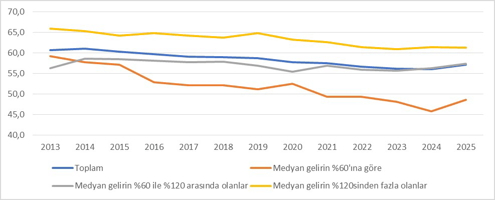 Şekil 4 – Gelir durumlarına göre ev sahipliği oranları, 2013-2025