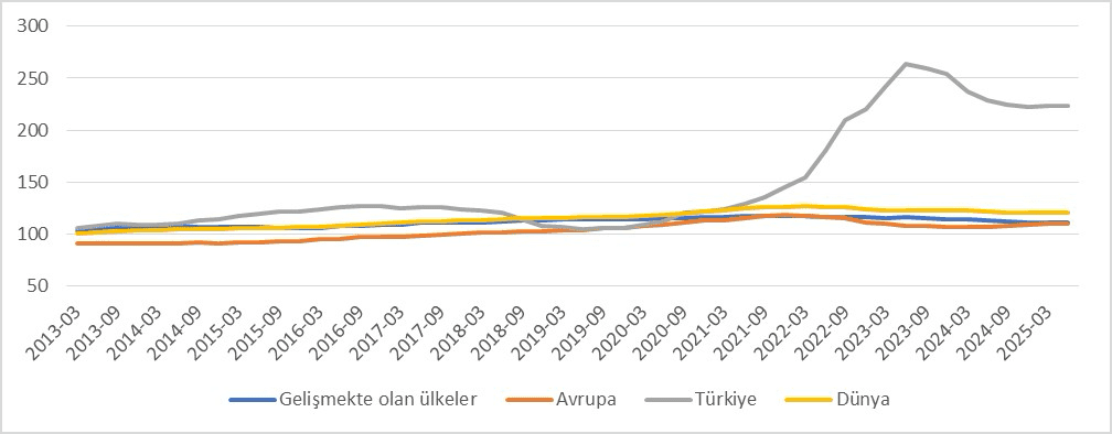 İnşaat sektörünün böylesine önemli görüldüğü bir dönemde konut sektörü bundan nasıl etkilendi? Bu büyüme konut fiyatlarına ve konut sahipliğine nasıl yansıdı? Her geçen gün konut almanın zorlaştığını ve fiyatların genel olarak arttığını görüyoruz. Peki bu durum sadece Türkiye’ye mi özgü, yoksa küresel bir eğilimin parçası mı? Şekil 1’de yer alan Uluslararası Ödemeler Bankası’nın (BIS) reel konut fiyat endeksleri, Türkiye’nin 2010–2019 döneminde Dünya, Avrupa ve Gelişmekte olan ülkelerle büyük ölçüde paralel seyrettiğini, ancak sonrasında reel konut fiyatlarında hızlanan ve ölçek olarak istisnai bir artış yaşandığını ortaya koymaktadır. İnşaat sektörü büyürken konut fiyatlarındaki bu sıçrama, konut sahibi olmak isteyenler açısından olumlu bir tablo yaratmamıştır. 2023 sonrasında reel fiyatlarda kısmi bir gerileme görülse de seviyeler hâlâ diğer bölge ortalamalarının oldukça üzerindedir. Bu durum, Türkiye’de konut piyasasında oluşan ayrışmanın geçici bir dalgalanma değil; ekonomik yapı, politika tercihleri ve piyasa işleyişi arasındaki ilişkinin bir sonucu olarak değerlendirilmesi gerektiğine işaret etmektedir.