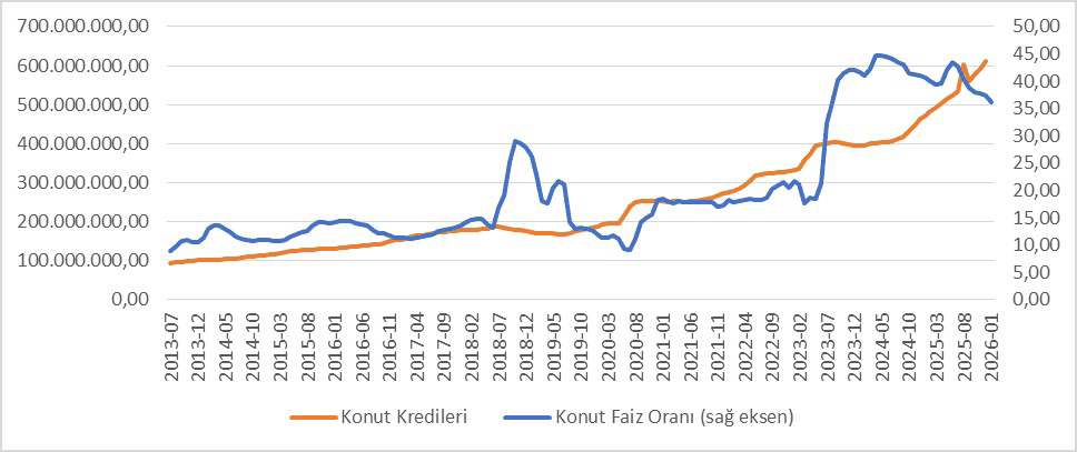 Şekil 3 – Konut kredileri ve konut kredi faiz oranı, 2013-2025