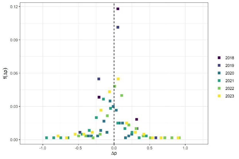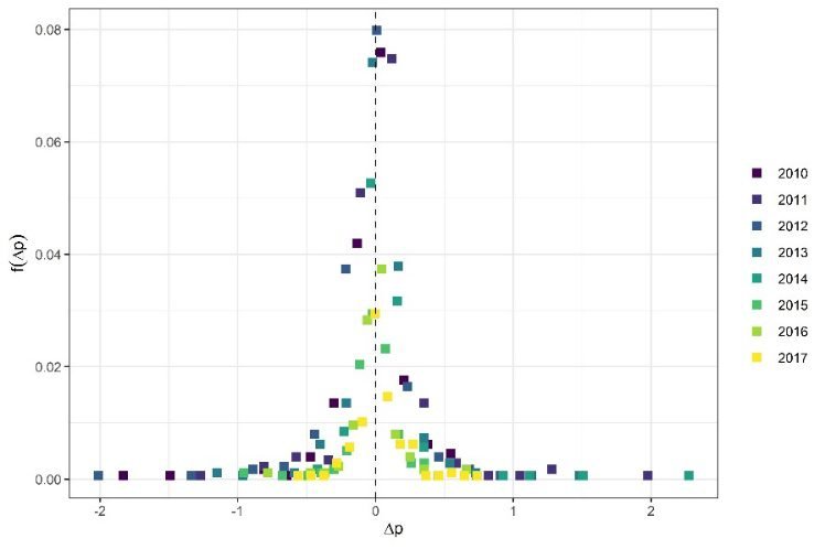 Δ, bu görselde bir yıldan diğer yıla yaşanan değişim oranını; f(Δp) ise belli üretkenlik değişim oranlarını ne sıklıkla gözlemlediğimizi ifade ediyor. 2010–2017 yılları arasında: i) Emek üretkenliğinin değişim oranı, kâr oranlarına kıyasla daha simetrik bir dağılım sergiliyor, ii) Kâr oranlarının aksine, %0 büyüme en sık gözlemlenen üretkenlik büyüme oranı, iii) Üretkenlik artışındaki durağanlık her örneklemde en sık gözlemlenen değer olmaya devam etse de, 2017’ye gelindiğinde dağılımın değer aralığı belirgin biçimde daralmış durumda.