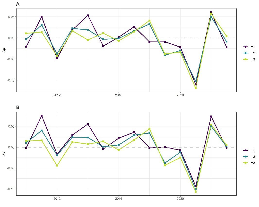 Yukarıdaki görsel iki panelden oluşuyor. Daha önceki görsellerde olduğu gibi, yatay eksen yılları, dikey eksen ise üretkenlik büyüme oranlarını temsil ediyor. m1, m2 ve m3 sırasıyla ortalama, medyan ve mod değerlerini ifade ederken; A paneli tüm firmaları, B paneli ise yalnızca pozitif kar beyan eden firmaları kapsıyor.
