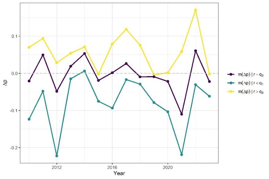Aşağıdaki görselde bu değişimin kar oranlarıyla ilişkisini özetlemeye çalıştım: en yüksek %20’lik kâr oranı dilimindeki firmaların üretkenlik büyüme oranlarının ortalama değeri “r > q5”, medyan kâr oranı dilimindeki firmaların üretkenlik büyüme oranlarının ortalama değeri “r = q3”, ve en düşük %20’lik kar oranı dilimindeki firmaların üretkenlik büyüme oranlarının ortalama değeri ise “r < q1” kısaltmalarıyla gösteriliyor. Görsel açık biçimde, yüksek kâr oranlarına sahip firmaların aynı zamanda görece yüksek üretkenlik artışları sergilediğini ortaya koyuyor.