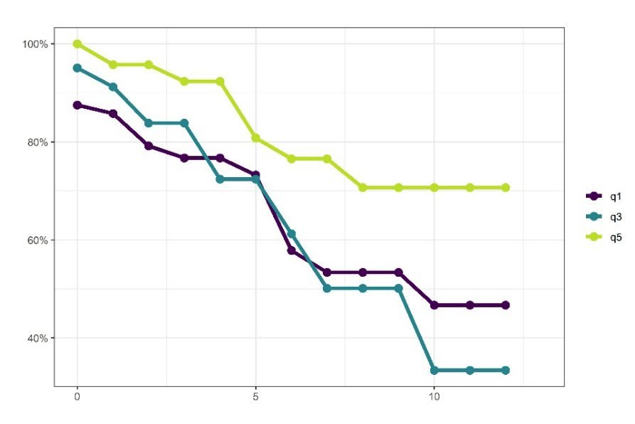 Daha önceki görsellerde olduğu gibi, q1 en düşük, q3 orta ve q5 en yüksek kar oranı gruplarını temsil ediyor. Yatay eksende, emek üretkenliği azalan firmaların bu ilk düşüşün ardından kaç yıl boyunca listede kalabildiği; dikey eksende ise her grubun yüzde kaçının listede kalmayı sürdürdüğü ölçülüyor.