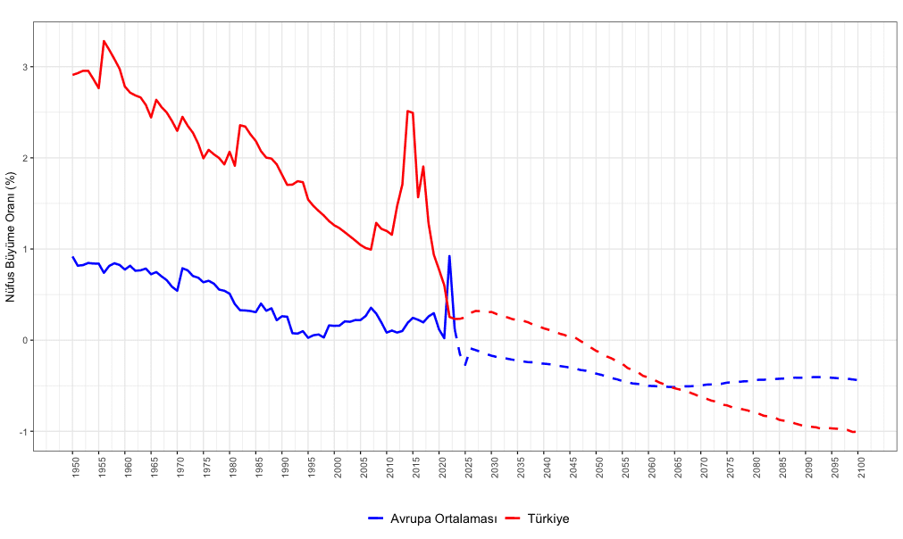Not: Grafiği, Birleşmiş Milletler Nüfus Büyüme Beklentileri veri setini kullanarak oluşturdum. Mavi renkle gösterilen Avrupa Ortalamasına dahil edilen ülkeler, Şekil 1’in altında not edilen ülkelerle aynıdır. Düz çizgiler gerçekleşen oranları gösterirken, kesikli çizgiler tahminleri yansıtmaktadır.
