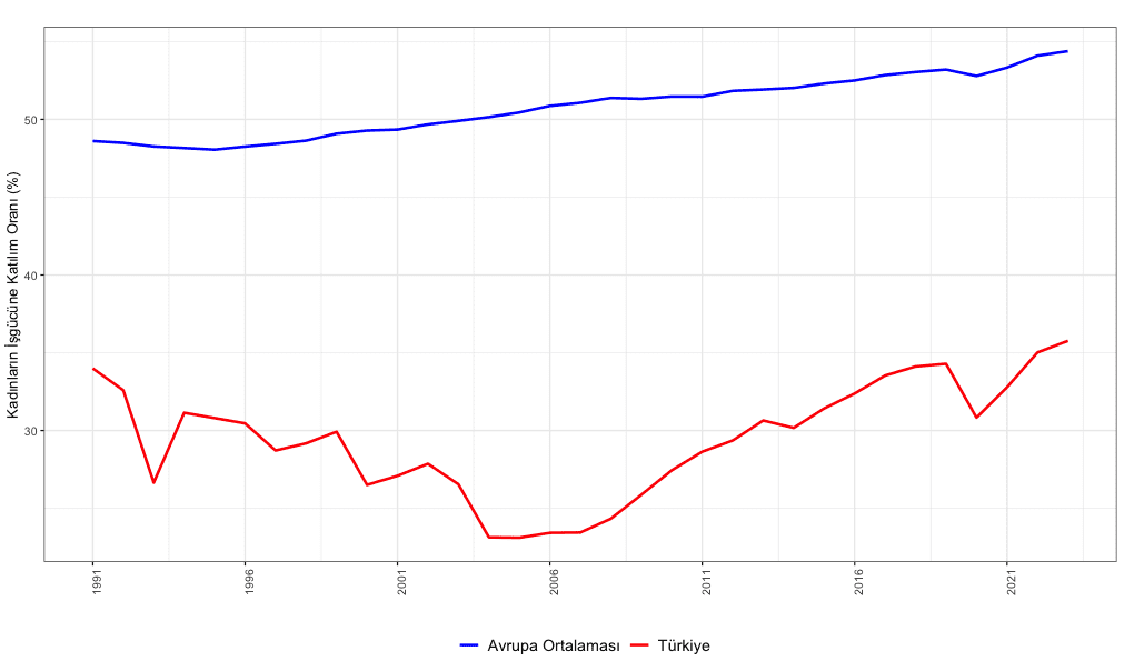 Şekil 5 Dünya Bankası verilerine göre kadınların işgücüne katılım oranını yansıtıyor. Bu oran Türkiye’de her ne kadar 2000’li yılların ortalarından bu yana artış göstermekte olsa da Avrupa ortalamasının hala çok altında. Bu resim bize Şekil 1’de gördüğümüz işgücü açıklarını kapatabilmek için yararlanabileceğimiz önemli bir kadın istihdam potansiyelinin varlığını gösteriyor[7]. A graph with a line and a red line