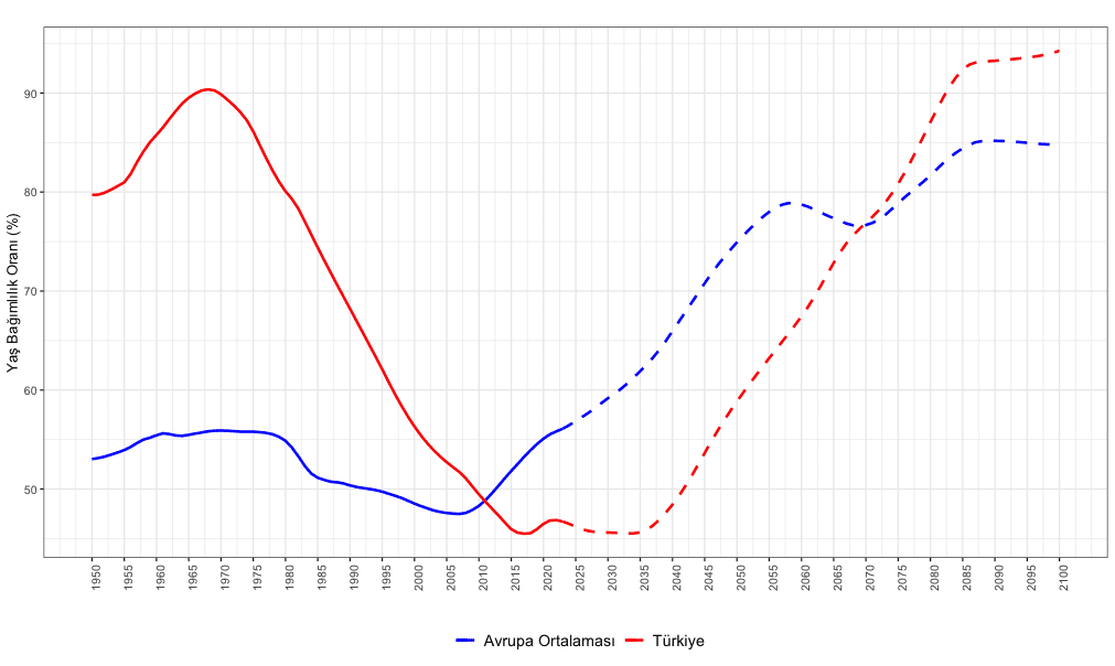 Not: Grafiği Birleşmiş Milletler Nüfus Büyüme Beklentileri veri setini kullanarak kendim oluşturdum. Yaş bağımlılık oranı, genç (15 yaş altı) ve 65 yaş ve üzeri nüfusun toplamının çalışma çağındaki nüfusa (15-64 yaş arası) oranını göstermektedir. Avrupa Ortalamasına dahil edilen ülkeler Şekil 1’in altında not edilen ülkelerle aynıdır.