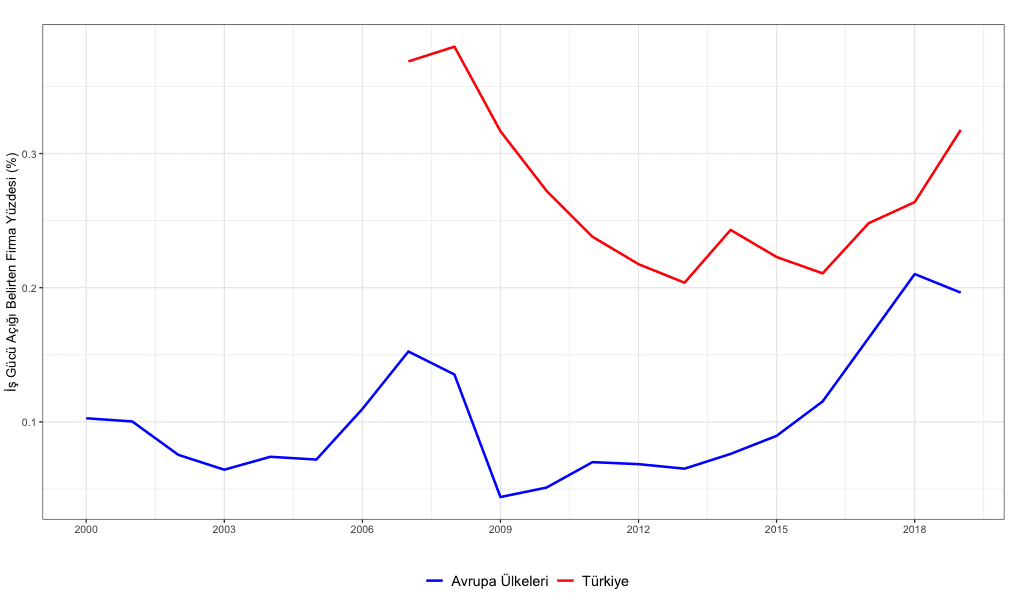 Not: Grafiği İşletme ve Tüketici Anketlerinden aldığım veriyi kullanarak oluşturdum. Bu ankette çeşitli Avrupa ülkelerinden seçilen firmaların yöneticilerine işletmelerini sınırlayan ana faktörler sorulmaktadır. Şirketlere olası faktörlerin bir listesi sunulmakta ve evet/hayır cevaplarıyla bir veya birkaç faktör seçmeleri istenmektedir. Grafik işgücü açıklarını üretimlerini kısıtlayan bir faktör olarak gören imalat sektörü firmaların oranını yansıtmaktadır. Mavi renkle gösterilen Avrupa ülkeleri ortalaması şu ülkeleri kapsamaktadır: Almanya, Avusturya, Belçika, Birleşik Krallık, Bulgaristan, Çekya, Danimarka, Estonya, Finlandiya, Fransa, Hollanda, İrlanda, İspanya, İsveç, İtalya, Letonya, Litvanya, Lüksemburg, Macaristan, Polonya, Portekiz, Romanya, Slovakya, Slovenya, Yunanistan.